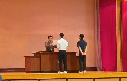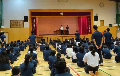 世田谷区陸上競技大会 走高跳の入賞生徒を表彰しました。 おめでとうございます。 最後に、出場した皆さんを拍手で称えました。
