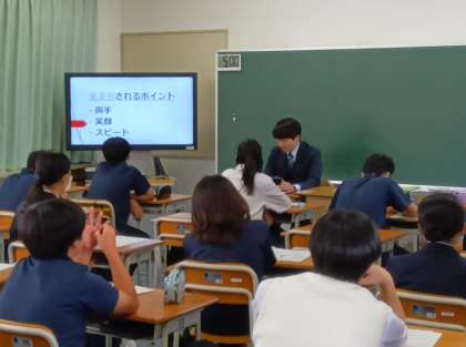 2年生 日本語 職場体験先の紹介CMを作ります。 今日は教員のデモンストレーションを視聴しました。(副校長)