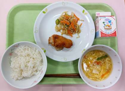 かきたま汁は、卵がふわふわです。ふわふわのコツは、今週の給食試食会で明らかになります。
