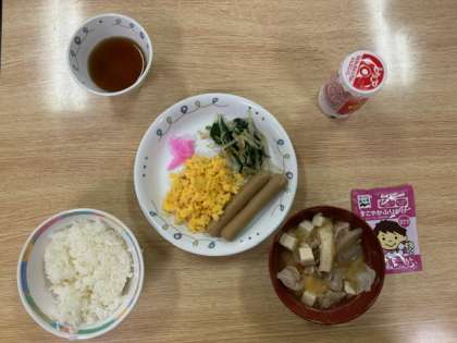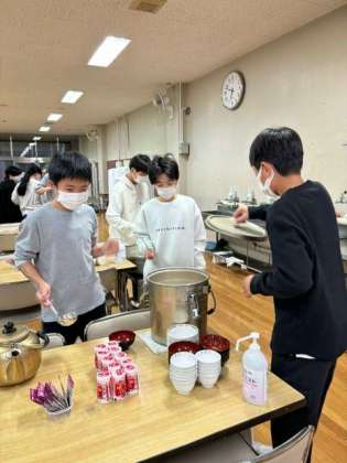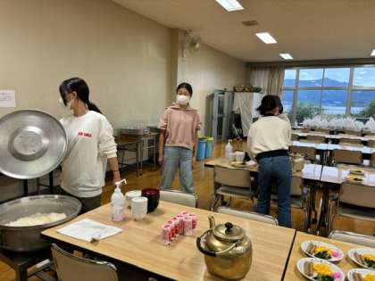 朝礼が終わり、食事係が朝食の準備を始めました。 テキパキと配膳を行っています。 ホカホカの朝ごはんです。