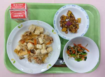 豆腐のうま煮丼は、豚肉、豆腐、人参、たけのこ、玉ねぎ、しめじを出汁で煮て醤油ベースの味付けにしたあんをご飯にかけています。生姜とごま油が効いていて美味しいです。