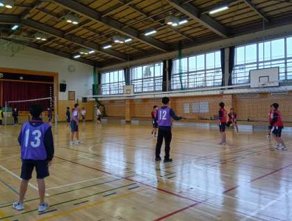 とにかく上げよう 公開日 2024/11/20 更新日 2024/11/20 できごと 3年生 保健体育 バレーボール 試合形式 サーブがうまい相手に、とにかく上に上げようと声を掛け合っていました。(副校長)