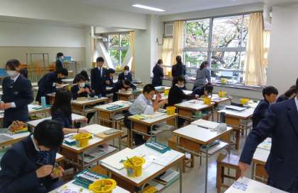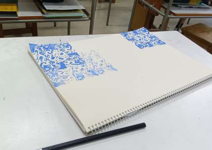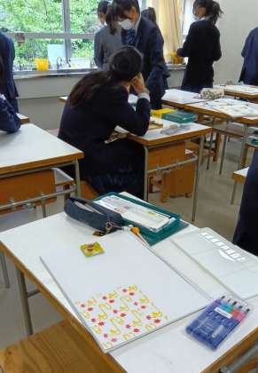 1年生 美術 消しゴムはんこ 配色を工夫してつなげると素敵な模様になりますね。(副校長)