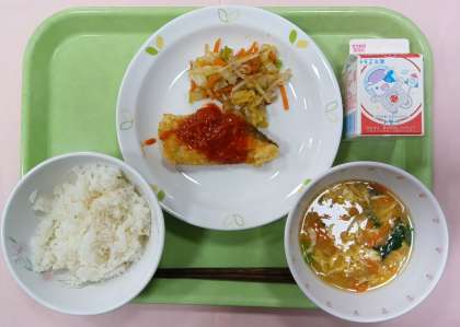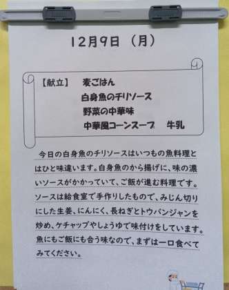 今日の給食 公開日 2024/12/09 更新日 2024/12/09 できごと 白身魚のチリソースは、スケトウダラに粉を振り油で揚げたあと、手づくりチリソースをかけていただきます。スパイシーで美味しいです。 野菜の中華味は、下茹でした野菜を手づくり中華ドレッシングで和えています。 中華風コーンスープは、ごま油が効いています。卵がふわふわです。 ご飯は麦入りです。 牛乳のカルシウムも取りましょう。 今日も調理員さん、ごちそうさまでした。
