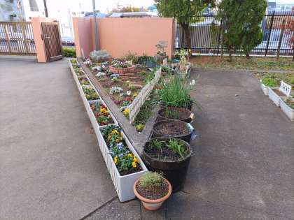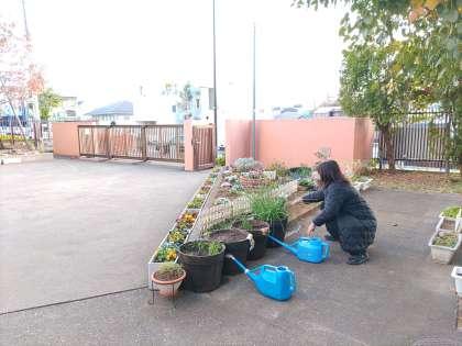学校支援コーディネーターの方がお花の様子を見に来てくださっています。