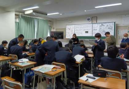 さて、写真は昨日の数学の研究授業の様子です。多くの教員が参観しました。授業後には教員同士で協議する様子が見られ双方が気づきを得ることができました。工夫を凝らした教材に生徒の目の輝きを見ることができました。今日はもう一方のクラスでも同様の授業を行います。昨日の反省を今日に生かします。(副校長)