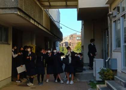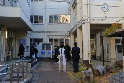 玄関前に大勢 挨拶運動をしている友達に付き合って一緒に挨拶していたのかな?(副校長)