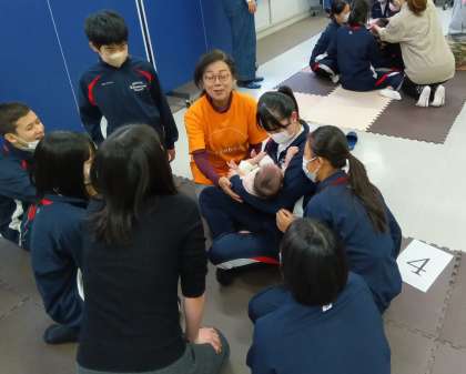 お人形のゆうたんで練習したあと、本物の赤ちゃんを抱っこします。赤ちゃんは、ごきげんの時もあれば泣き出してしまうこともありますね。