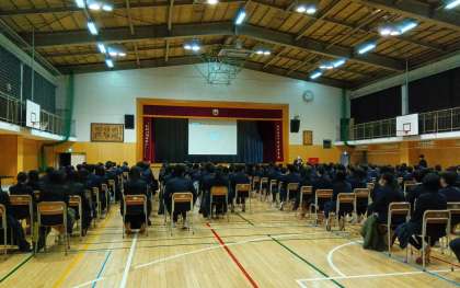 北沢警察署のスクールサポーターの方をお迎えし、セーフティ教室を行っています。(副校長)