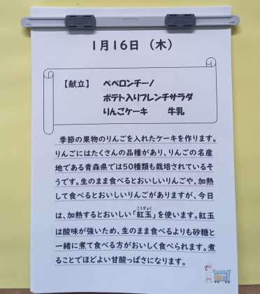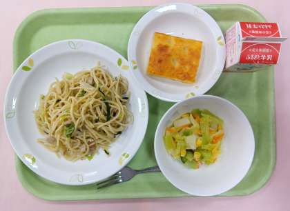 今日の給食 公開日 2025/01/16 更新日 2025/01/16 できごと ペペロンチーノは、ベーコン、しらすやキャベツ、小松菜が入っています。アルデンテの美味しいパスタです。 ポテト入りフレンチサラダは、からし入りの手作りドレッシングが美味しいです。 りんごケーキは、りんごの爽やかさが感じられるケーキです。 牛乳のカルシウムもとりましょう。 今日も調理員さん、ごちそうさまでした。(副校長)