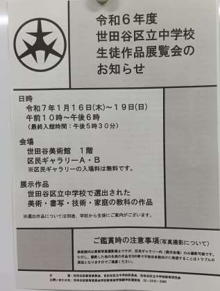 写真は、世田谷区生徒作品展のご案内です。日曜日まで世田谷美術館で展示しています。区内の中学生の力作ぞろいです。お時間のある方はお運びいただければ幸いです。(副校長)