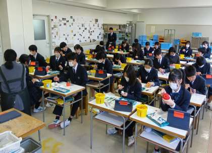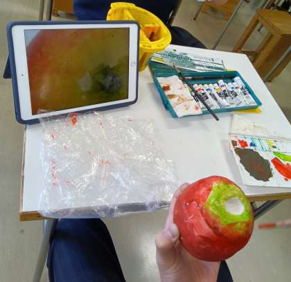 じっくり見ると見えてくる 公開日 2025/01/17 更新日 2025/01/17 できごと 1年生 美術 模刻 本物そっくりに作ろう 実物の写真をよく見て細部まで作り込みます。 均一ではない本物のへこみや、しわ、色合いの違いを表現しています。布で磨くとりんごのツヤもでてきます。(副校長)