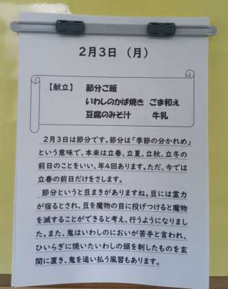 節分ご飯は、大豆、人参、刻み昆布、油揚げを甘めのだし醤油煮たものを炊き上がった味付けご飯に混ぜています。油揚げにしみた出汁が美味しいです。大豆の茹で加減もちょうどいいです。