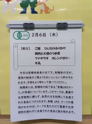 今日は有機米給食です。有機米動画をクラスで視聴しました。有機JASマークを初めて知りました。