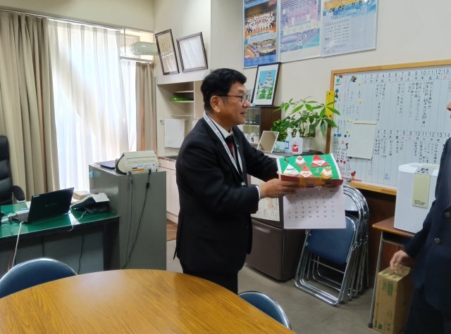 昨日、おおぐま学級の生徒たちが校長室を訪れました。来年度の手づくりカレンダーを校長に手渡しました。校長は、カレンダーを1ページずつめくりながら、よく工夫したね。と生徒に声をかけました。