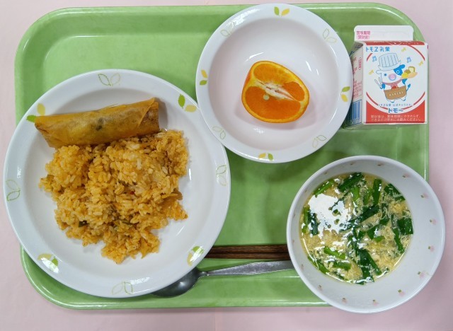 春巻きは、パリパリです。ニラ玉スープは、鶏ガラスープに、玉ねぎ、豆腐、鶏肉、ニラが入って卵でふわふわに仕上げています。
