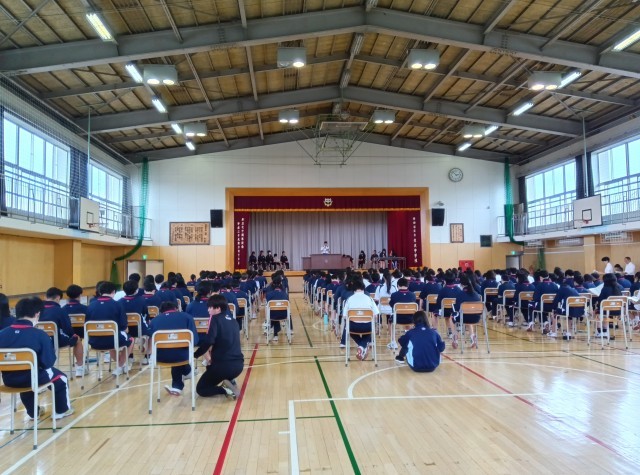 写真は、先週の生徒総会の様子です。代表で発表する皆さんの責任感と生徒の皆さんの真剣な態度に感心しました。これからの生徒会、委員会活動が充実するよう期待しています。