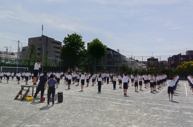 ラジオ体操は、1回で合格。このあと、バトンパスと大縄跳びの練習をします。(副校長)