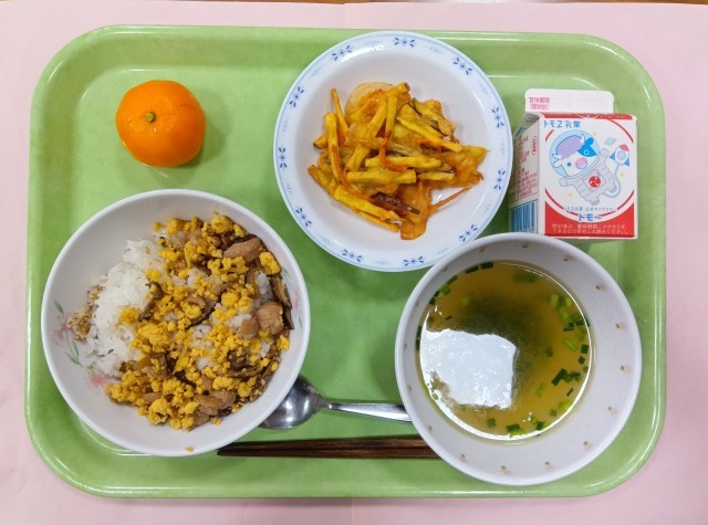 牛乳のカルシウムもとりましょう。今日も調理員さん、ごちそうさまでした。(副校長)