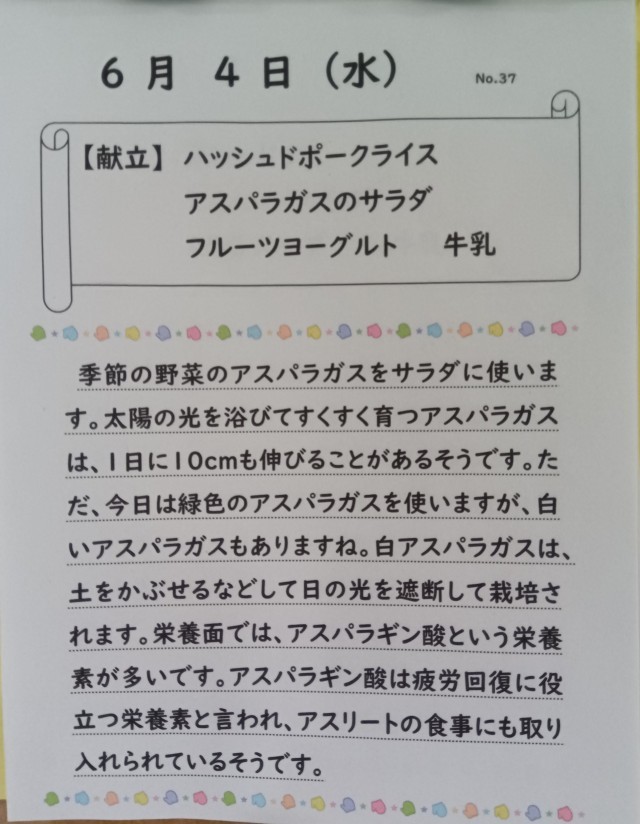 アスパラガスのサラダは、疲労回復によいと栄養士がこの日に選んだメニューです。ドレッシングに入っているおろし玉ねぎの酸味も美味しいです。