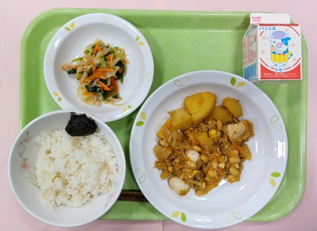 牛乳のカルシウムもとりましょう。今日も調理員さん、ごちそうさまでした。(副校長)