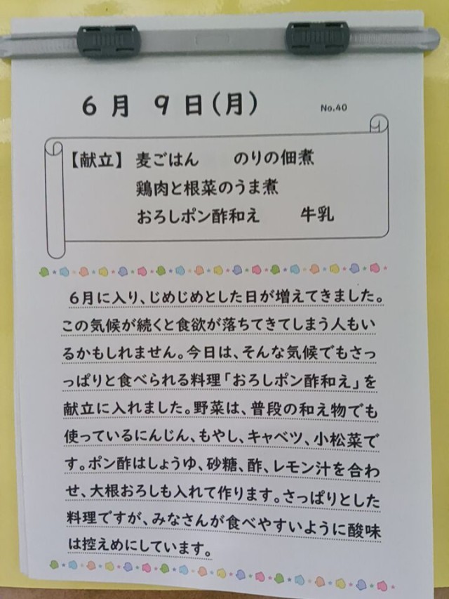 おろしポン酢和えは、スッキリ爽やかな和え物です。給食にでてくる色んな味わいの和え物は家庭料理の参考にもなりますね。