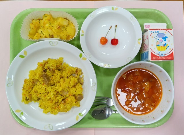 メキシカンピラフは、カレー味のスパイシーなピラフです。学校給食では、お米を炊くときに調味料を加え、具材は、別に炒めて炊き上がったご飯に混ぜています。とても美味しいです。