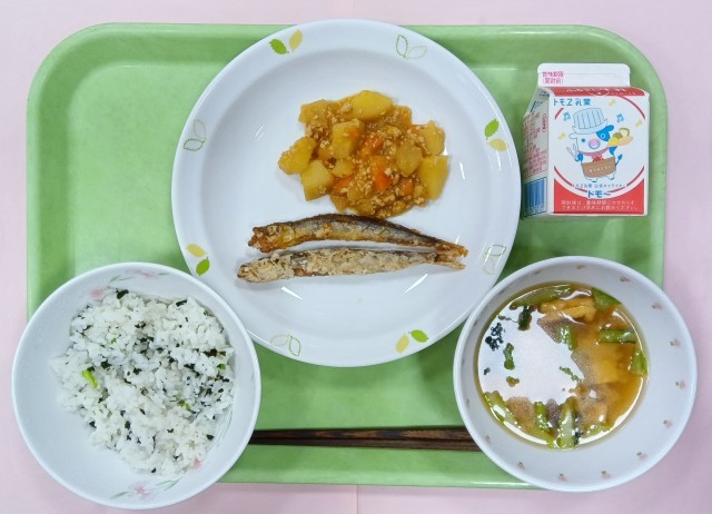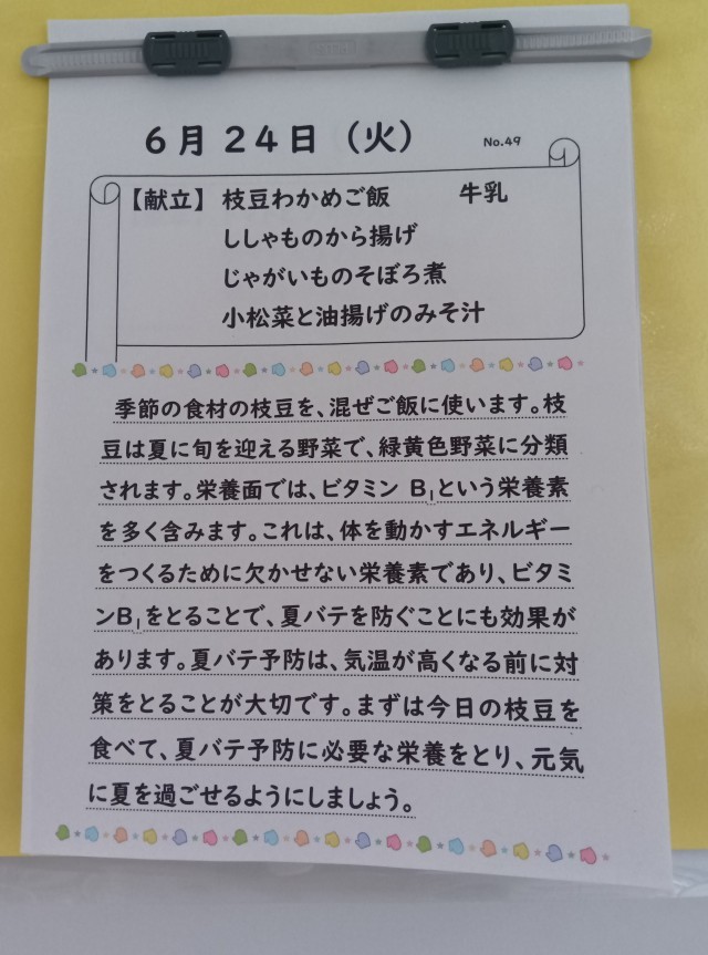 枝豆わかめご飯は、炊き上がったご飯に茹でた枝豆と炊き込みわかめを混ぜています。富士中と合わせて8キロ近くもある枝豆をさやから出す作業は大変だったと思います。