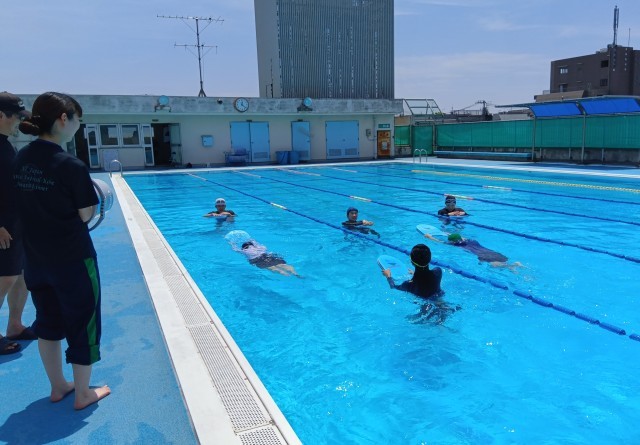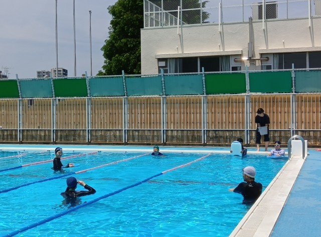 休憩や水分補給の時間を取りながら、25メートル泳ぐことを目標にスモールステップで練習していました。(副校長)