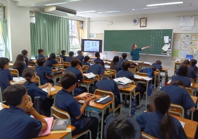 中学校での書道は初めてなので、注意事項を伝えています。(副校長)