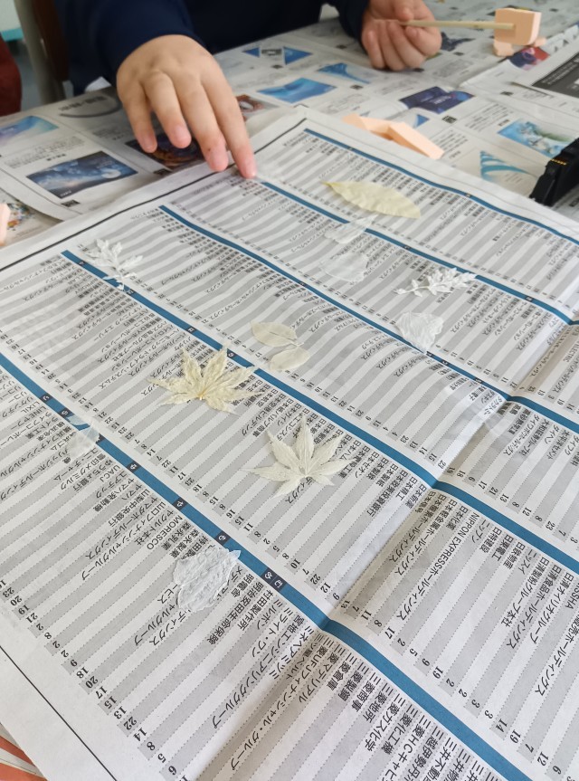 今日で実習生が最後だったので、お別れ会を開催してもらいました!水酸化ナトリウムと漂白剤を使い、真っ白にした葉っぱに色付けをして、しおりやキーホルダーを作りました。