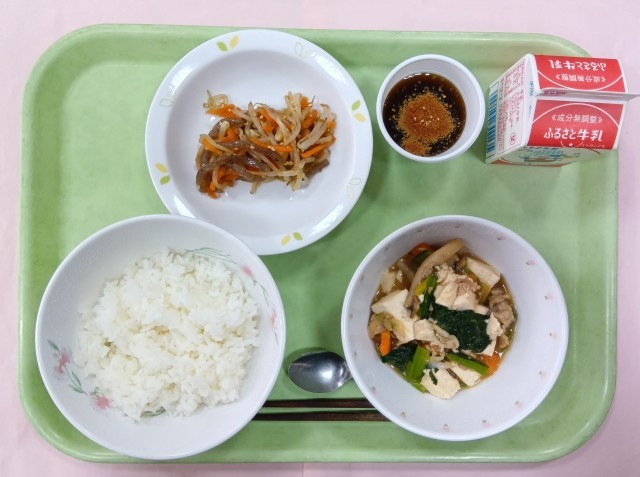 今日は有機米給食です。ご飯の甘さが違いますね。肉豆腐は、豆腐、豚肉だけでなく、人参、椎茸、筍、しめじ、長ねぎ、小松菜が入っています。味噌と醤油で味付けし、ごま油で仕上げています。糸こんにゃくともやしの...