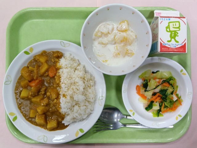 今日は王道、チキンカレーライスです。スパイシーでコクのある美味しいカレーライスです。ご飯は押麦入りです。シーフードサラダは、イカとえびが入っています。ワインを入れてボイルしたえびは、プリプリです。玉ね...