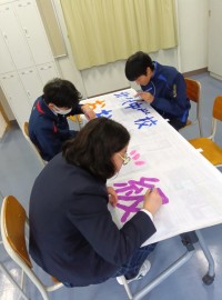 来年度の連合球技大会や合同マラソン大会で使用する横断幕を制作しています。この授業は生徒の発案から生まれました。作業をする前に、「丁寧」とはどういうことかを考えてから色塗りを始めました。完成品は北斗祭で...