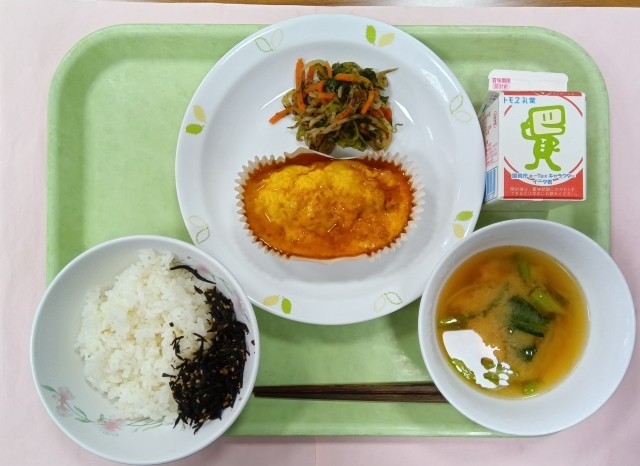 今日もメニューに変更がありました。ご飯は白米、手づくりひじきふりかけをかけていただきます。あんかけ卵焼きは、筍やしらす、豆腐などが入った卵焼きに出汁醤油などで調味したあんをかけています。上品な美味しさ...