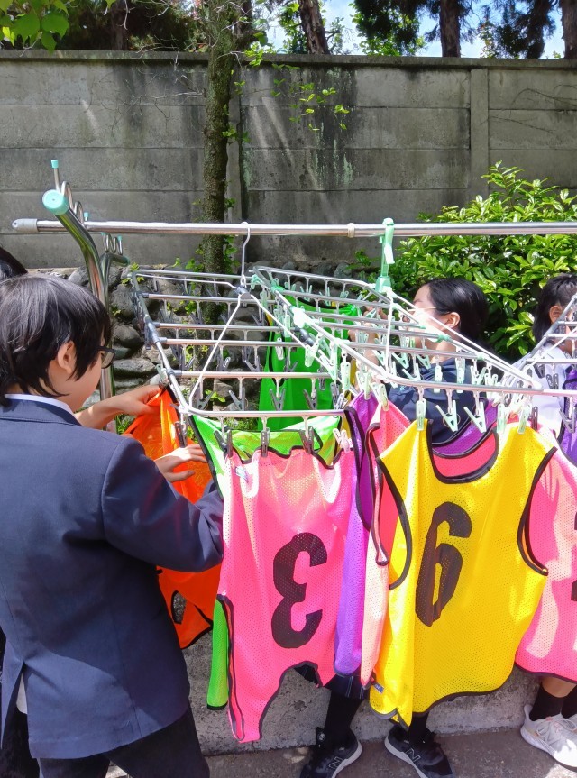 これから本格的に運動会練習が始まります。昨年度からおおぐま学級では、生活単元学習という授業で学校のゼッケンを洗濯しています。事前に洗濯機の使い方や干し方のコツを調べてから作業に移っているので、全員がテ...