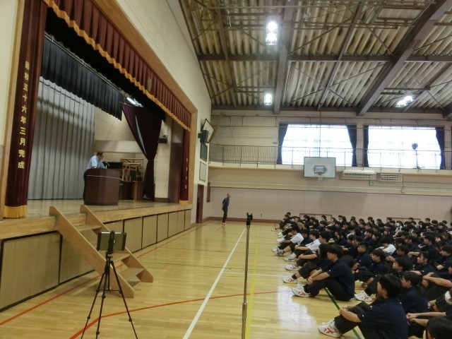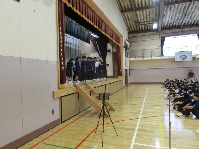 始業式は校長先生のお話、校歌斉唱、卓球部表彰、安全指導、生活指導がありました。