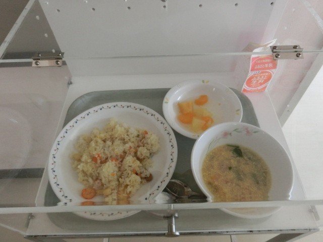 メニューは牛乳、シーフードピラフ、卵と青菜のスープ、フルーツポンチです。スープには鶏肉も入り栄養満点です。残さず食べましょう。