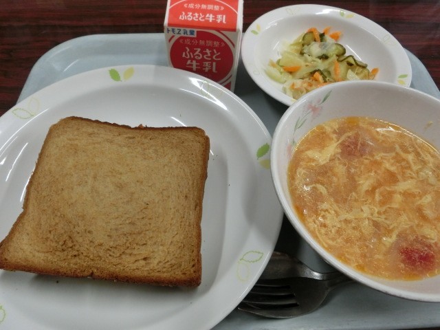 メニューは牛乳、ツナピザトーストサンド、卵とトマトのスープ、フレンチサラダです。サラダは缶詰のパインアップル入りです。残さず食べましょう。