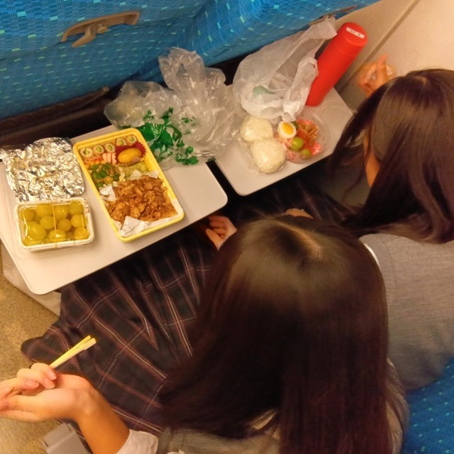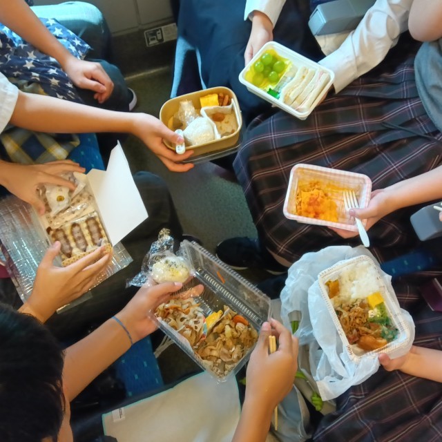 車内では昼食の時間になり、みんなで美味しくいただいています!