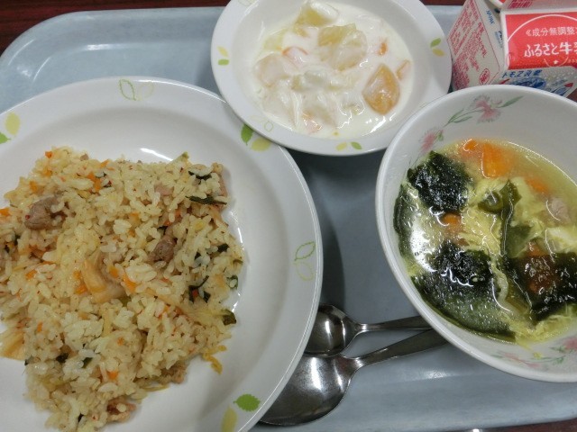 メニューは牛乳、キムチチャーハン、卵とわかめのスープ、フルーツのヨーグルトかけです。キムチは乳酸菌が豊富な食品で腸内環境を整えます。残さず食べましょう。
