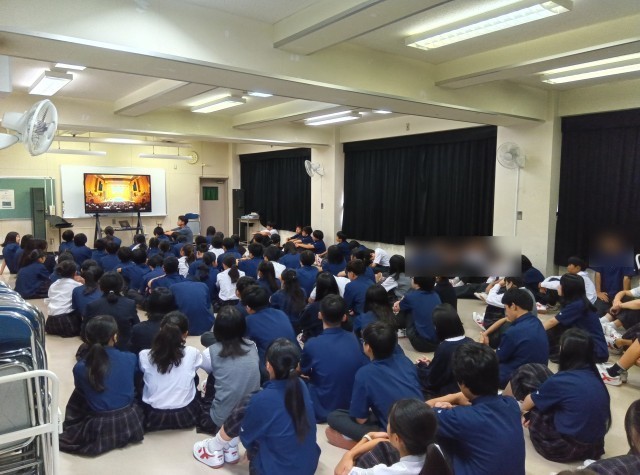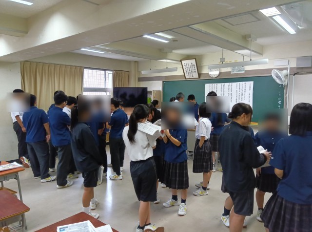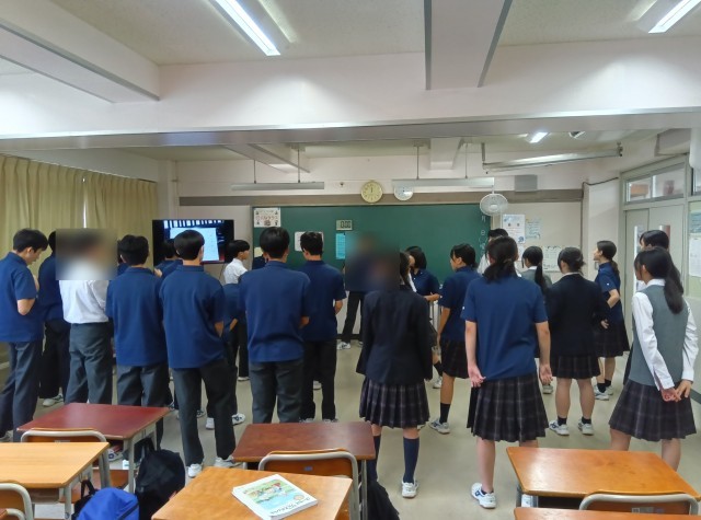 1年生は多目的室に集まり、昨年度の合唱の様子をビデオで視聴しました。