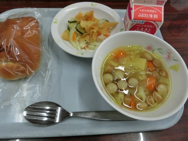 メニューは牛乳、チーズダイスパン、カレーポトフ、パリパリサラダです。ポトフは野菜もたくさん入り栄養満点です。残さず食べましょう。