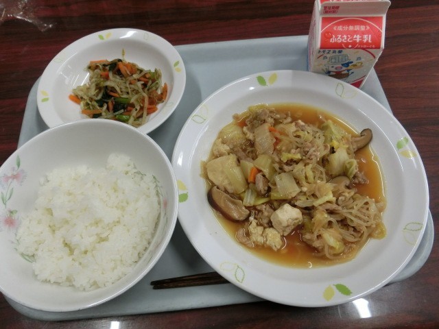 メニューは牛乳、ごはん、野菜の海苔和え、すき焼き煮です。すき焼き煮は甘辛く食欲が進みます。残さず食べましょう。