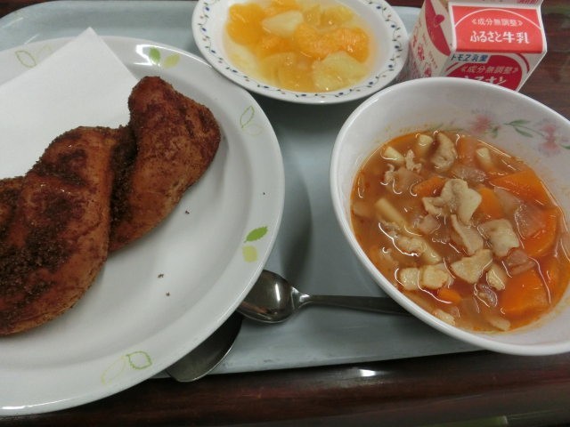 メニューは牛乳、ココア揚げパン、ひよこ豆入りミネストローネ、フルーツポンチです。甘い料理が2種類あり生徒には好評です。