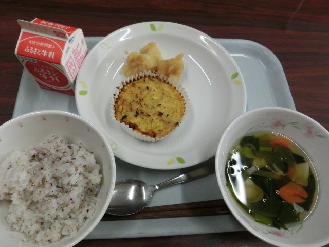 メニューは牛乳、ゆかりご飯、すまし汁、じゃがいもの甘辛煮、切り干し大根の卵焼きです。