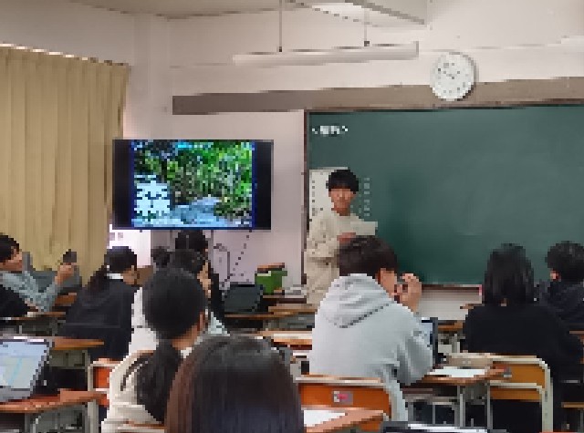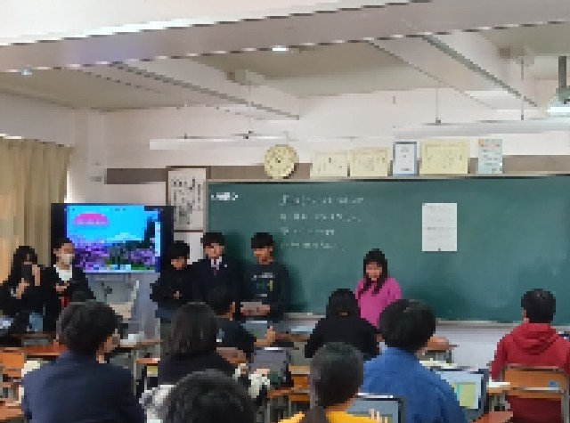 制作した自作のポスターをテレビに映し出しながら、実際に行ってみた感想やその場所の魅力をクラスメイトの前で発表しています。
