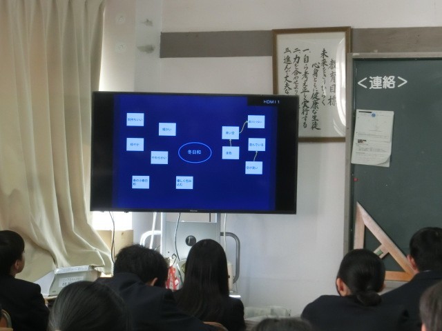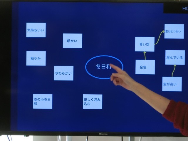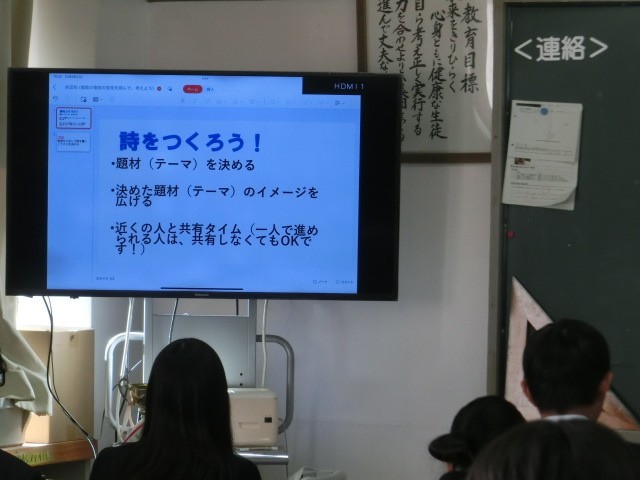 1年1組で詩を作る授業を行いました。詩を紡ぐために、言葉をまとめる作業を先生から教えていただき作業しました。