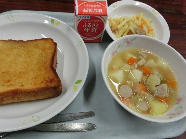 メニューは牛乳、メープルトースト、ポトフ、マカロニソテーです。メープルトーストはバターとメープルシロップがたっぷりで食欲が進みます。残さず食べましょう。