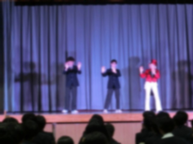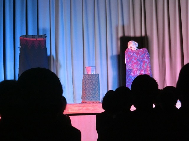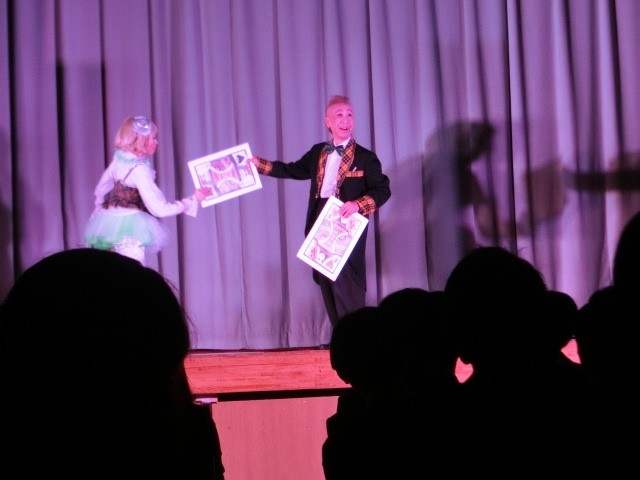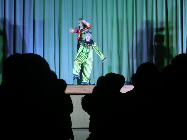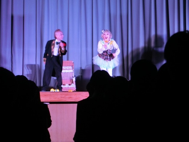 5,6時間目に2年生はパントマイムと手品のショーを観ました。魔法の冒険「いつも心に花束を」という題目で、様々な花がマジックで咲きました。